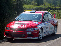 Sin duda el equipo que despertaba más expectación, sobre todo entre los aficionados asturianos, era el formado por Sergio Fombona y Enrique Velasco. Sergio hacía un paréntesis en su temporada mundialista para salir en el rallye de casa con un EVO VIII del equipo de Roberto Méndez y se marcaba un rallye colosal, scratch absoluto en Santa Bárbara incluido, que le ponía cuarto de la general y primero de grupo N. Lamentáblemente todo se iba al garete en la segund apasada por ese tramo, último del rallye, cuando una salida de pista frustraba un resultado que sergio merecía y necesitaba tras su mala suerte en Alemania. |