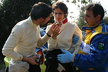 Y siguiendo con copilotos lesionados (¡vaya mala racha que llevan!) destacar el valor y pundonor de la debutante Alba Fernández Miranda que sufrió la peor parte en el fuerte golpe del 205 pilotado por Francisco Marrón. Una espectacular salida de carretera en el tramo de Perlora, golpeando fuertemente contra un talud y acabando por aterrizar en el mismo lugar donde había volcado el Escort de Jesús Alvarez minutos antes, obligó a neutralizar el tramo y aconsejó la intervención del R y la ambulancia para atender a Alba. Finalmente la valiente "copi" sólo sufrió magulladuras y ya estaba "vestida de calle" y con collarín en la entrega de premios, lógicamente dolorida pero con ganas de volver a montarse en el asiento de la derecha. ¿Quien dijo que son el "sexo débil"? |