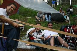 Estos aficionados se montaron todo un palco vip, con toldo, cámara en trípode ... ¡y paella para comer! |