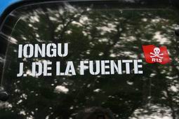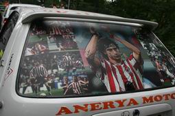 El Saxo de Germán Agreda llevaba esta muy futbolera decoración en su luneta trasera |