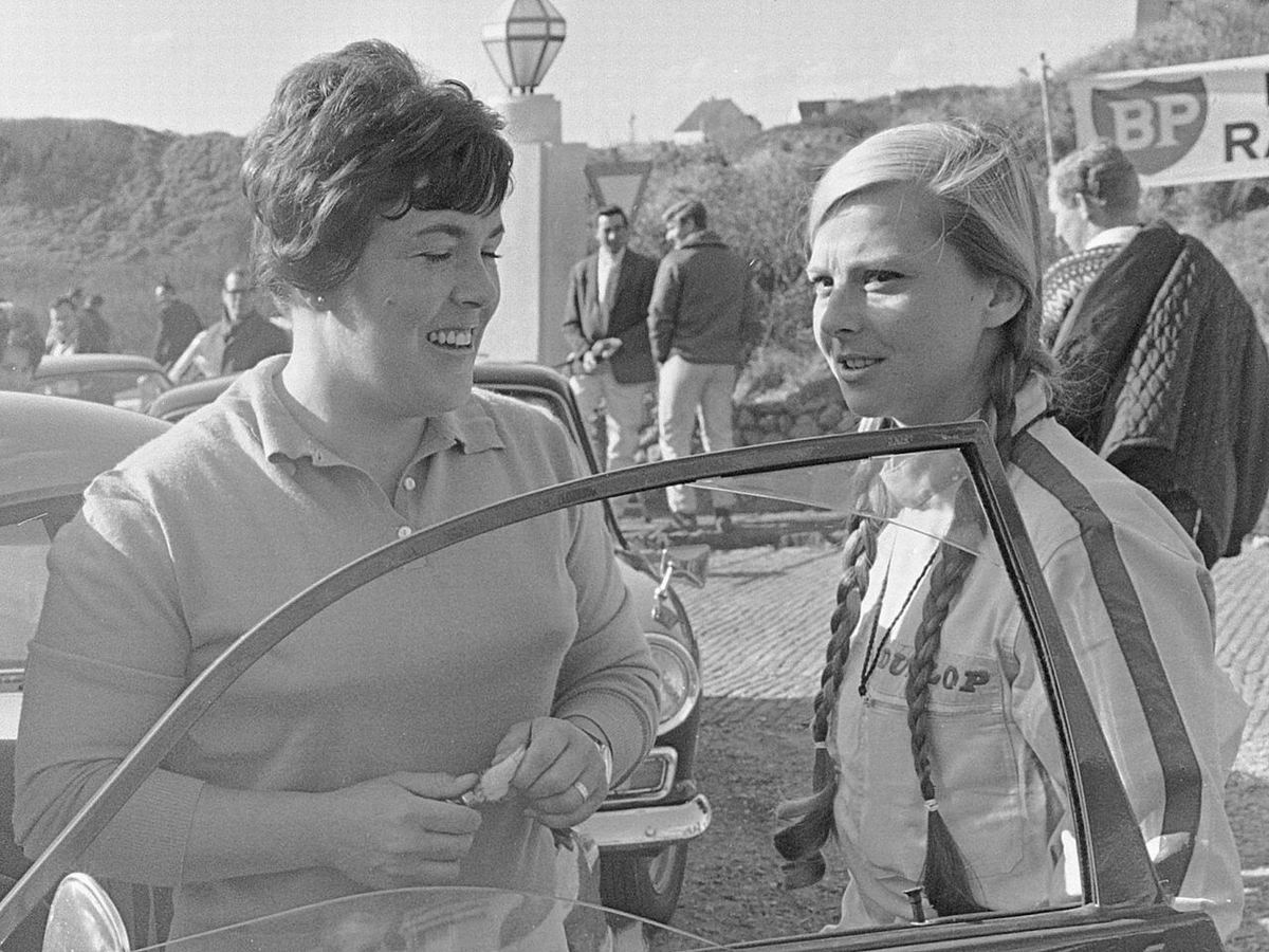 Tras ellos van apareciendo los coches que aún quedan en carrera. Todos están sucios por el barro. Muchos muestran sobre sus carrocerías los efectos de golpes más o menos fuertes. Y hay que esperar cerca de cuatro horas para que llegue uno que sume un total de penalizaciones que ponga en duda el liderato mantenido desde el principio por los hermanos de origen hindú, de quienes les separa sólo un minuto en el cómputo total. Es otro vehículo sueco, el Saab rojo que lleva pintado en blanco sobre sus puertas el número 77 y conduce con brío Pat Moss. La británica y su copiloto, Elizabeth Nyström, tampoco han tenido problemas graves, han rodado a muy buen ritmo y mantienen las opciones de triunfo que ya se han esfumado para el equipo formado por su esposo y su hermano con la otra unidad oficial de la marca.