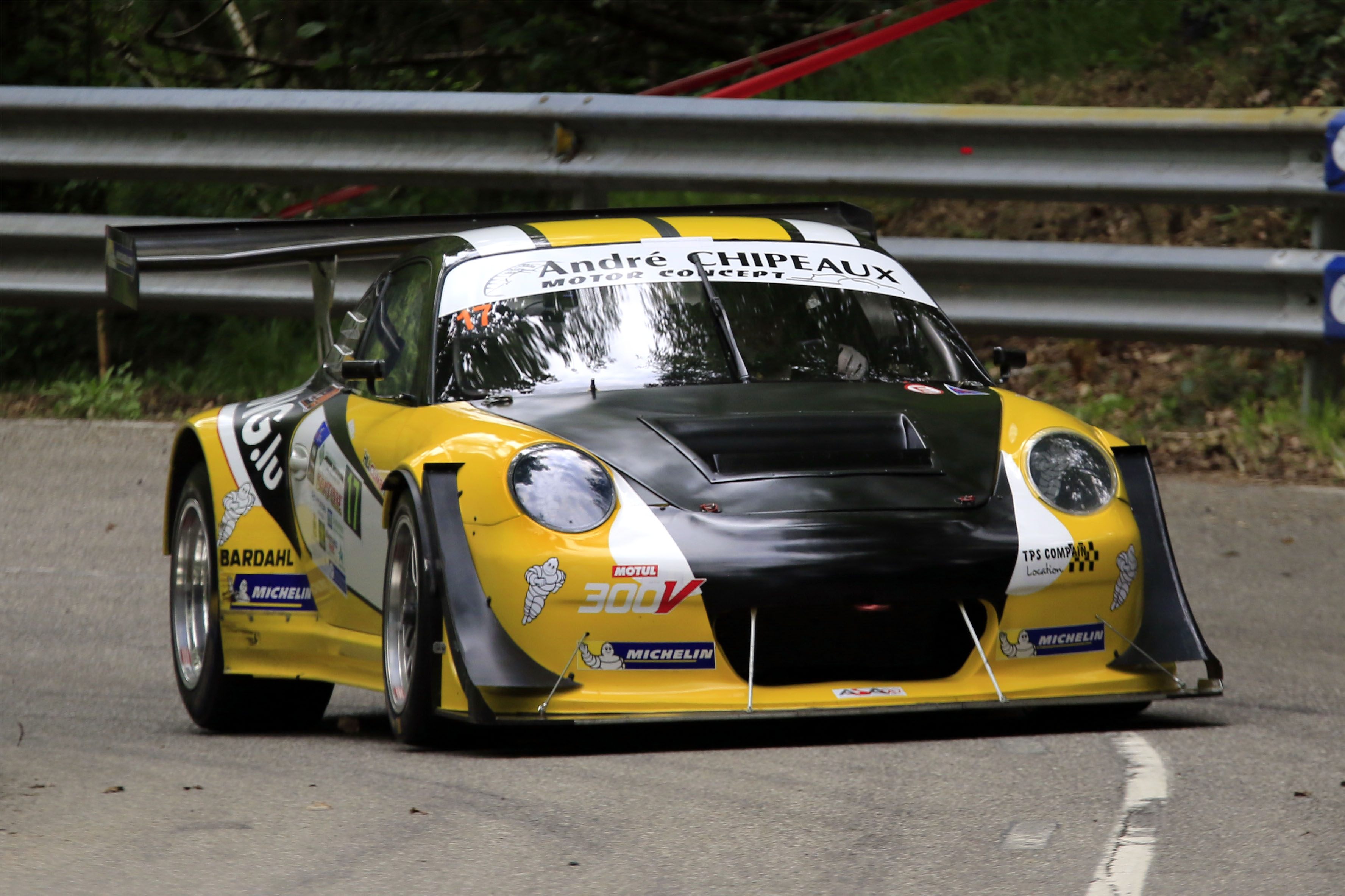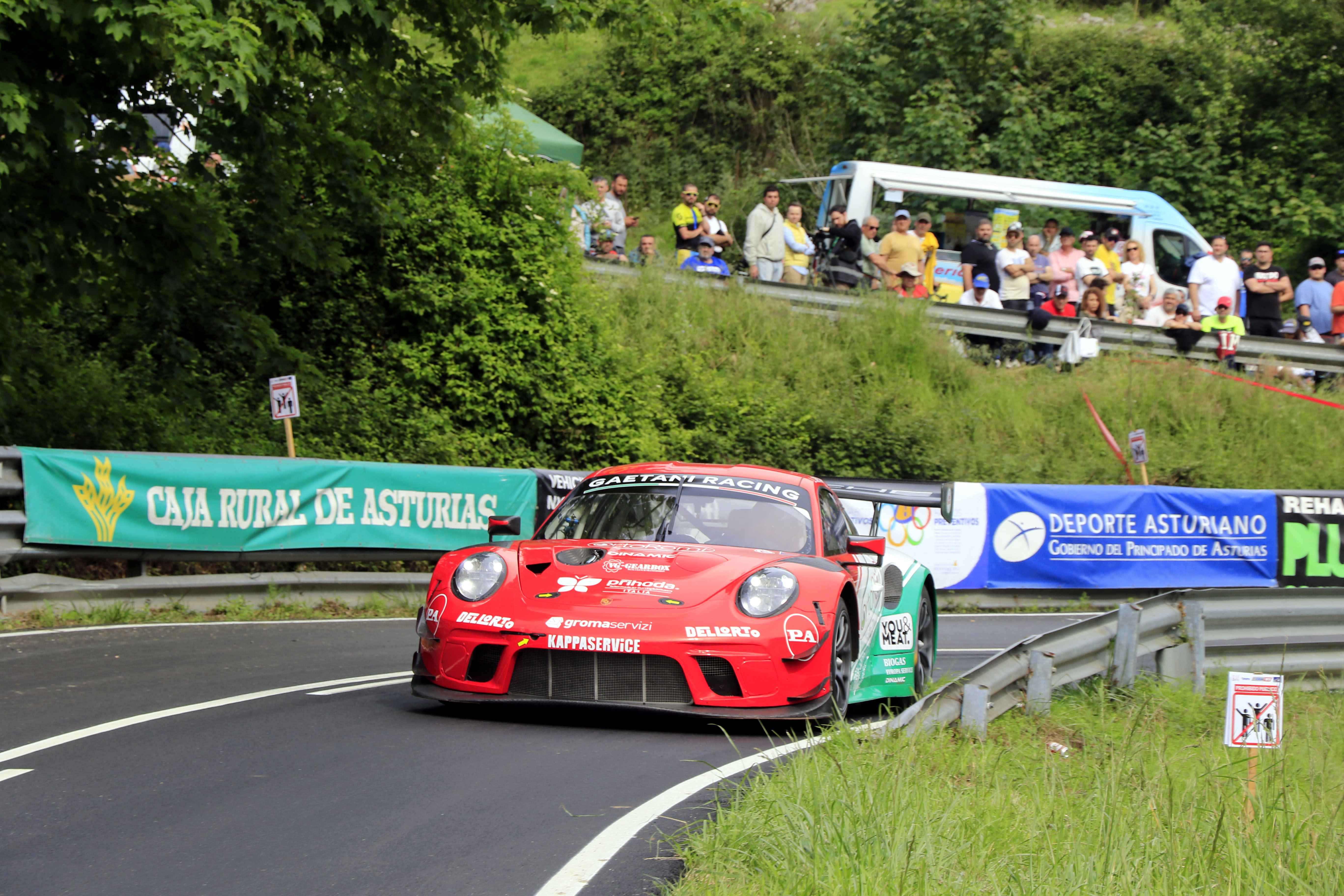 Un vistazo a la lista de inscritos mostraba cuatro candidatos claros a los puestos de podio en la categoría de 'carrozados' del Campeonato de Europa. Tres eran los ganadores en las tres anteriores ediciones, el suizo Ronnie Bratschi, vencedor en el 2021 con su muy musculado Mitusbishi EVO VII RS, el gijonés José Antonio López-Fombona, ganador en el 2022 cuando estaba prácticamente de estreno con su flamante Audi RS5 DTM, y el francés Nicolas Werver, que había impuesto en el 2023 su poderoso Porsche 997 GT3 RS. El cuarto era el italiano Luca Gaetani, que llevaba una versión GT3 R más moderna del eterno deportivo de Stuttgart y venía dispuesto a sacarse la espina de su discreto debut el año anterior, cuando un toque le había añadido a la lista de pilotos del europeo que han sufrido un golpe más o menos duro en su primera visita al Fito.