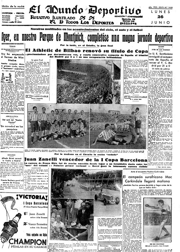 Portada de 'El Mundo Deportivo' del 26 de junio del 1931 con la noticia sobre la I Copa Barcelona de Automovilismo en Montjuich.