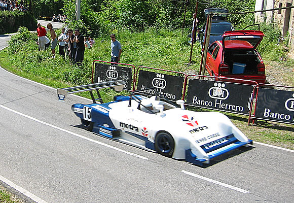 El orden de salida, con los ‘fórmulas’ abriendo la lista de inscritos y, por tanto, siendo los últimos en salir, situaba a continuación a los pequeños monoplazas del regional asturiano, entre los que Víctor Abraham conseguía un notable 2:52 que le clasificaba justo tras las mejores barquetas y por delante de los carrozados. Ausentes ya los fórmulas plateados de Irigoyen y Egozkue, fuera de combate por sendas averías, su Ralt azul claro precedía al Reynard de azul más oscuro pilotado por Vilariño. El Fórmula 3000 del piloto vasco tomaba la salida impulsado hacia delante como un disparo por toda la potencia de su poderoso motor Mugen V8 de 3000 centímetros cúbicos y casi 500 caballos. La estrecha carretera de montaña parecía quedarse pequeña ante la brutalidad de un vehículo muy radical, concebido para los espacios más abiertos de los circuitos y que apenas podía desplegar parte de su fuerza en las zonas más rápidas. Por mucho que Andrés lo intentaba, batir el crono de Tschager era misión imposible. Es más, aunque conseguía rodar ya por debajo del 2:40 y cruzaba la meta en 2:38.698, no acababa de estar satisfecho del rendimiento del monoplaza y quedaba también lejos del magnífico registro conseguido por Regosa.